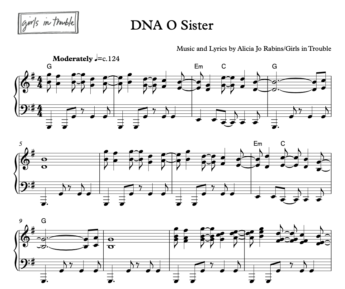 Play and sing “DNA O Sister” with guitar, piano, or your instrument of choice! Comes as a zip file of pdf downloads. Includes chart (lyrics and chords), lead sheet, and piano-vocal score; see product gallery for images of each.